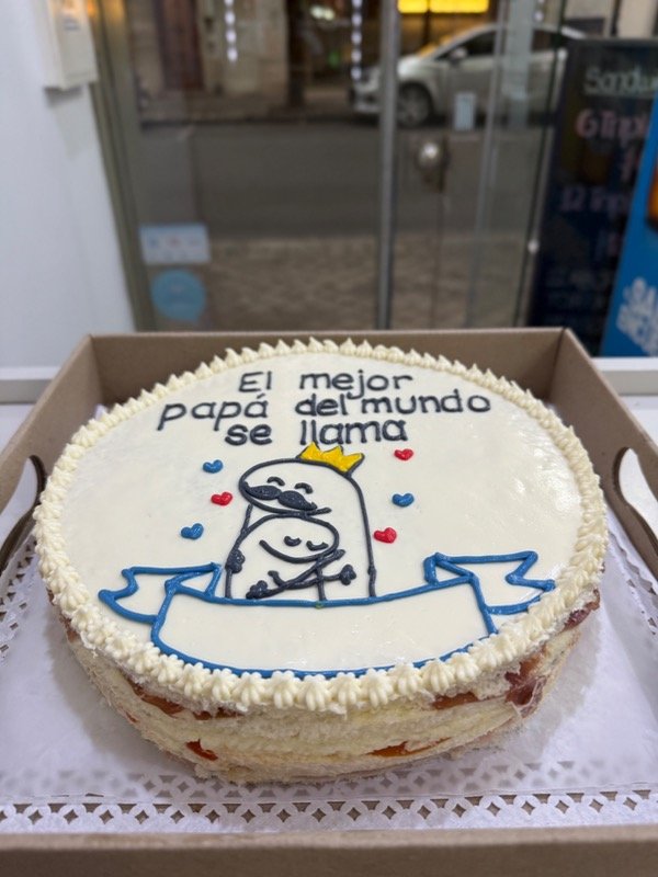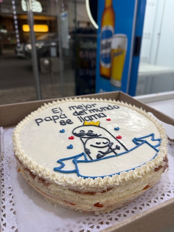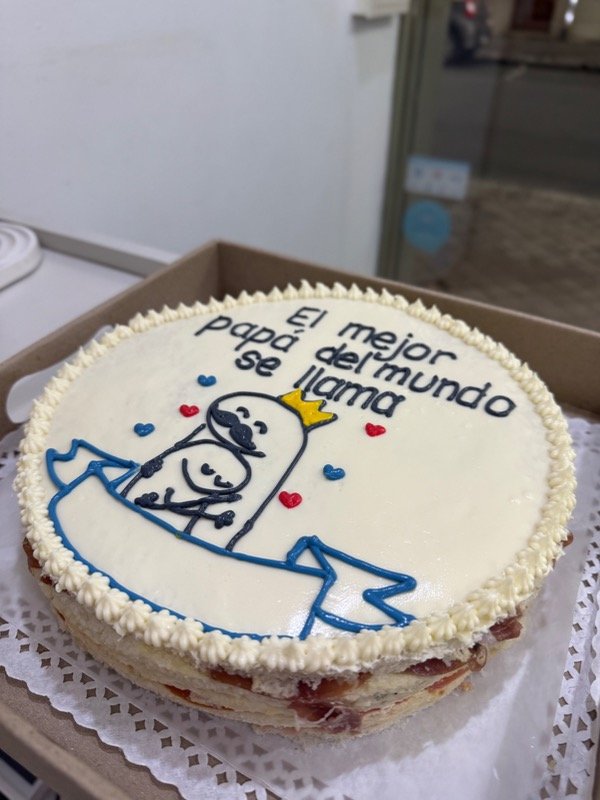 Torta de 6 capas con relleno a elección. Mide 24 cm de diámetro. Decoración realizada con queso crema.